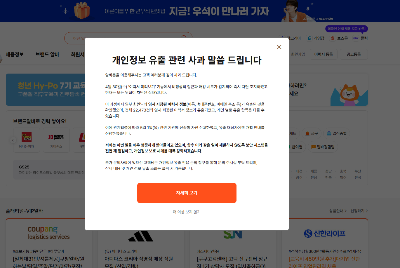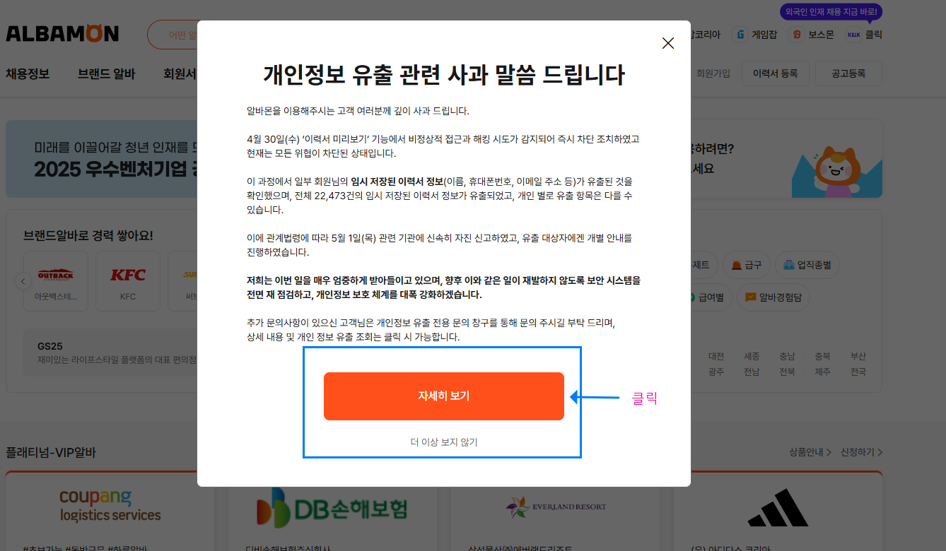 2. 메인 팝업 사과문 자세히 보기 클릭